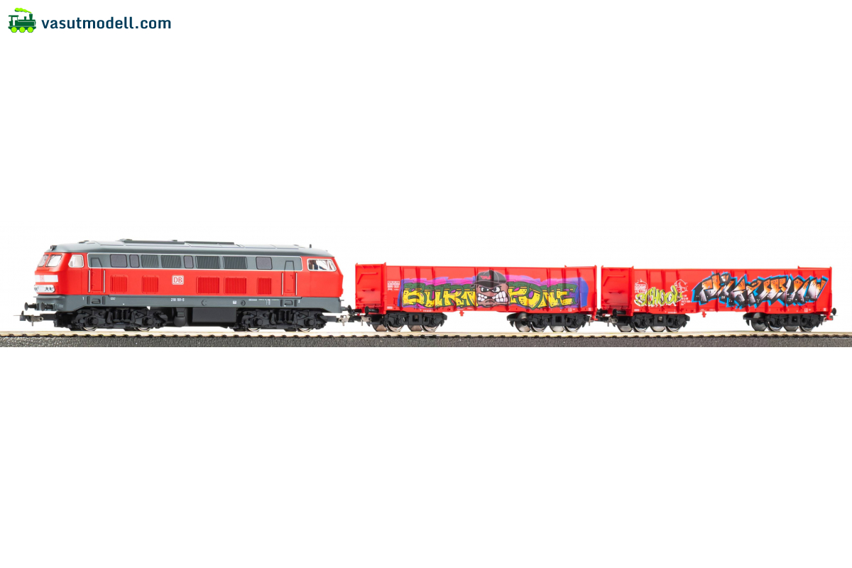PIKO 57032 Analóg kezdőkészlet: BR218 dízelmozdony + graffitis teherkocsik (ágyazatos A-Geis sínekkel)